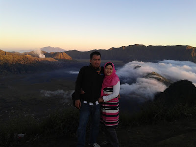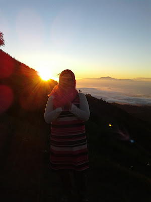 Begitu sampai puncak, nggak sadar saya langsung loncat dari motor. Panorama yang tersaji di depan hidung saya begitu Subhanallaaah gantengnya. Awan putih yang seolah berada di bawah kaki saya terbentang luas, seluas samudera, seperti kasur empuk yang melambai-lambai minta ditiduri. Lalu perlahan sang fajar muncul dari balik bukit. Di kejauhan sana, Bromo terlihat menyempil diantara gunung lain. Aih, jadi susah berkata-kata nih. Saya pun sukses ndlongop haru, hati saya bergetar, dan tanpa terasa air mata saya menitik. Begitu cantiknya Indonesia! Tambah cinta deh kepada Lumajang, kepada Indonesia.